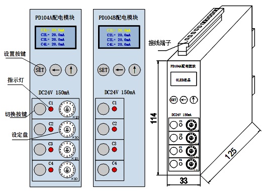 PD104系列直流配電控保模塊是DC24V直流配電系統(tǒng)控制保護模塊,以下簡稱模塊,該模塊具備1路輸入、4路輸出控制電源,同時OLED液晶實時顯示4路電流值。