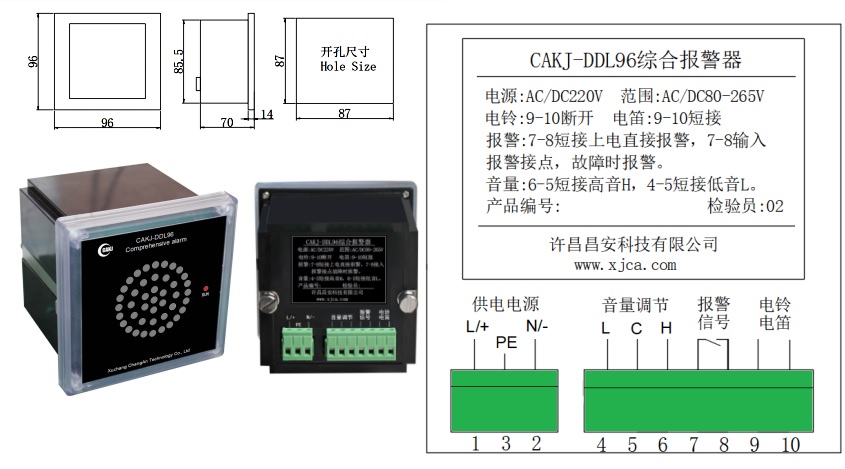 CAKJ-DDL96綜合報警器,是為電力系統(tǒng)中央信號報警而設(shè)計的一款低功耗、無干擾、大音量電子式報警設(shè)備。采用單片機模擬電磁式電鈴電笛聲音頻譜,其發(fā)聲與電磁式電鈴電笛發(fā)聲相似度達98%。