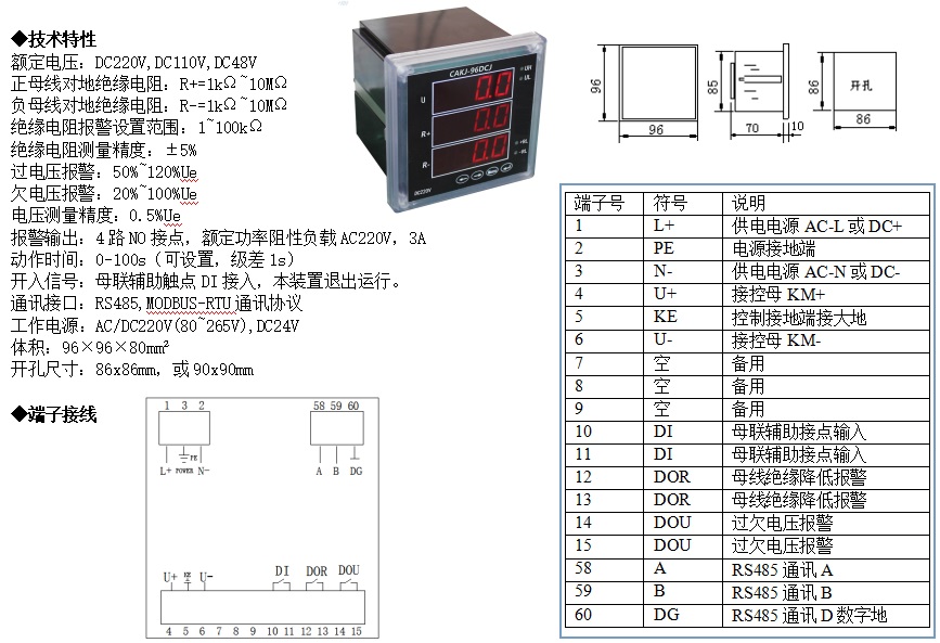 CAKJ-96DCJ絕緣監(jiān)察裝置,適用于DC300V以下直流不接地系統(tǒng)絕緣監(jiān)測。通過橋式比較電路及乒乓輔助判斷電路,準(zhǔn)確計算出直流母線正負(fù)極對地絕緣電阻(單母線絕緣降低或雙母線平衡絕緣降低),并給出不同信號,為直流系統(tǒng)故障分析提供依據(jù)。