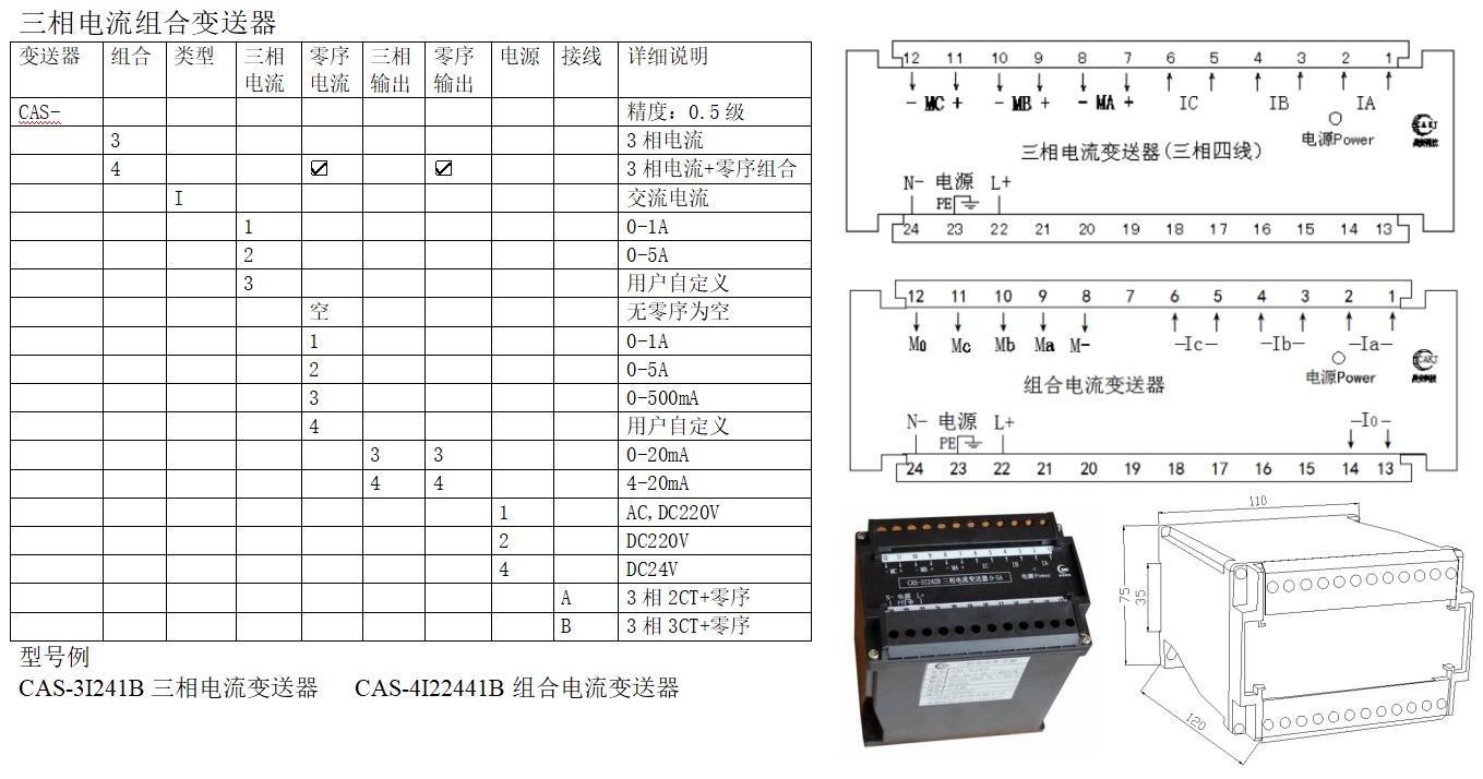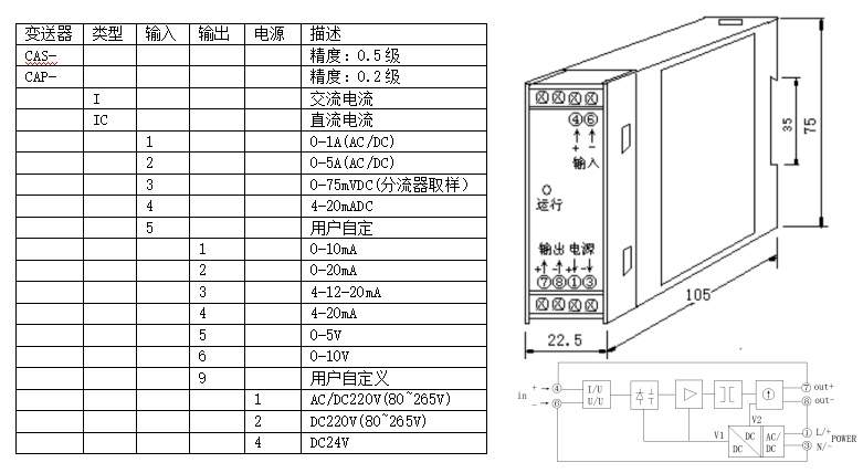 CAS系列電量變送器是將被測交直流電流、電壓等信號轉換成按線性比例輸出直流電流、電壓并隔離的設備。