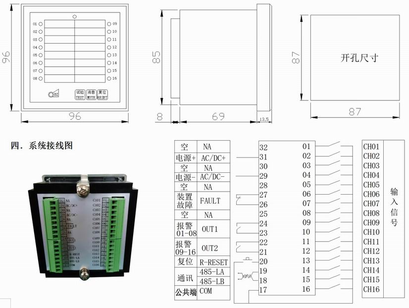 a.16個LED指示燈分別指示各路信號狀態(tài)(正常-滅,報警-閃光,消音-亮,正常后按復位鍵-滅)。