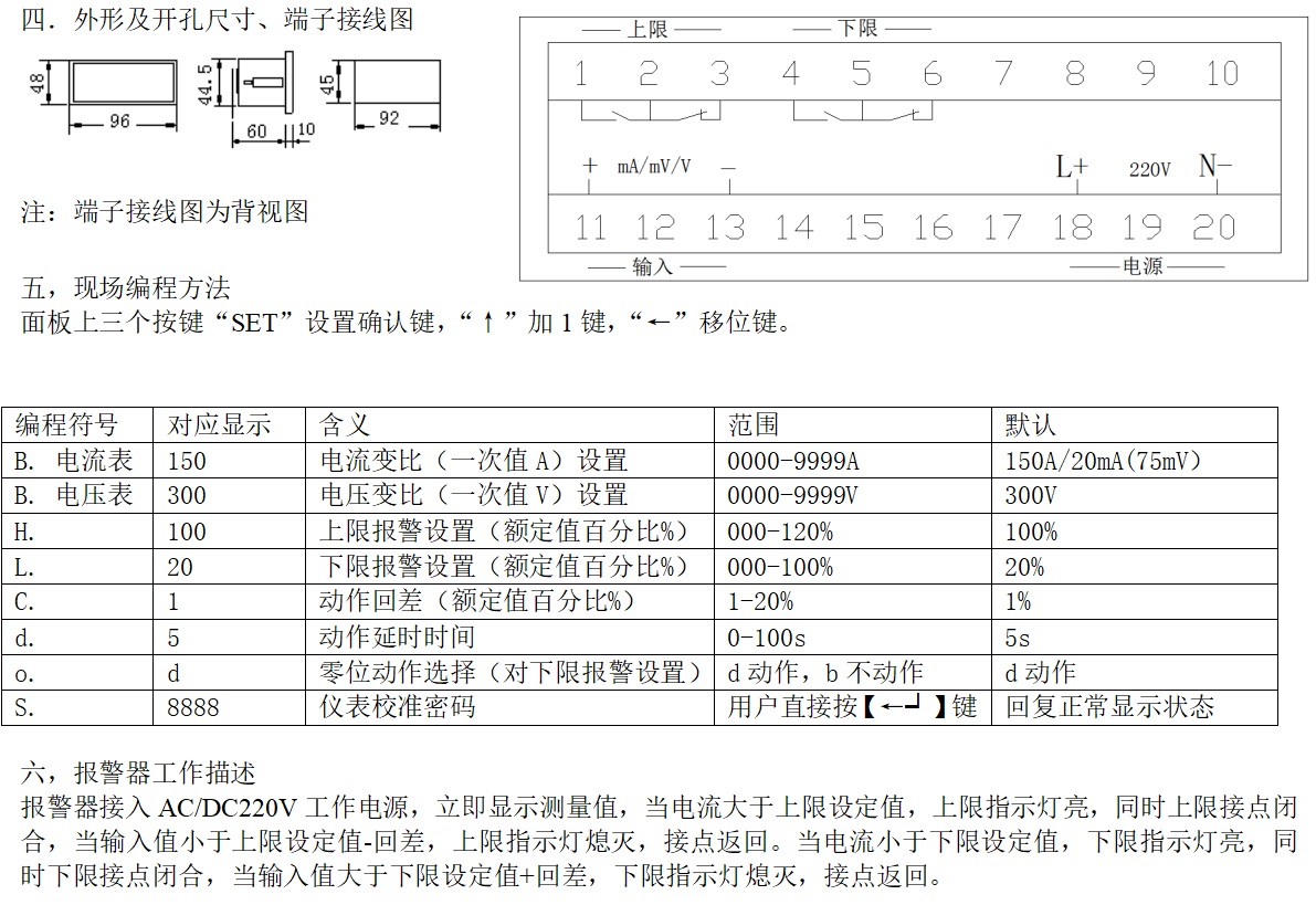 參數(shù):直流電流或電壓測(cè)量,上限,下限報(bào)警